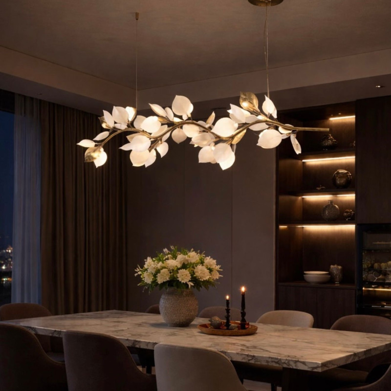 Opaline Chandelier's harmonious blend of frosted botanical accents and brushed gold accents creates a sophisticated statement.